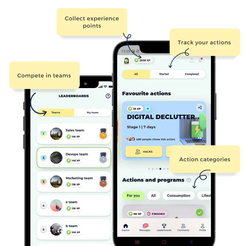 Ailuna offers tailored programs that empower employees to take sustainable actions and develop green habits, using gamified teamwork and incentivized rewards.